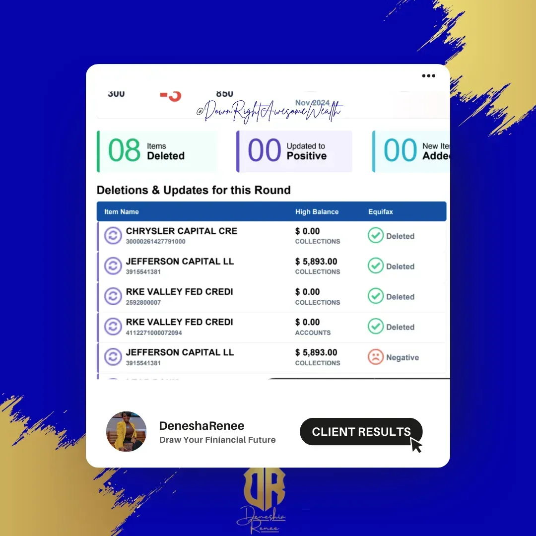 At Down Right Awesome Wealth, your success is our success. Let us show you the difference exceptional customer care can make! Contact today and start restoring your credit score!